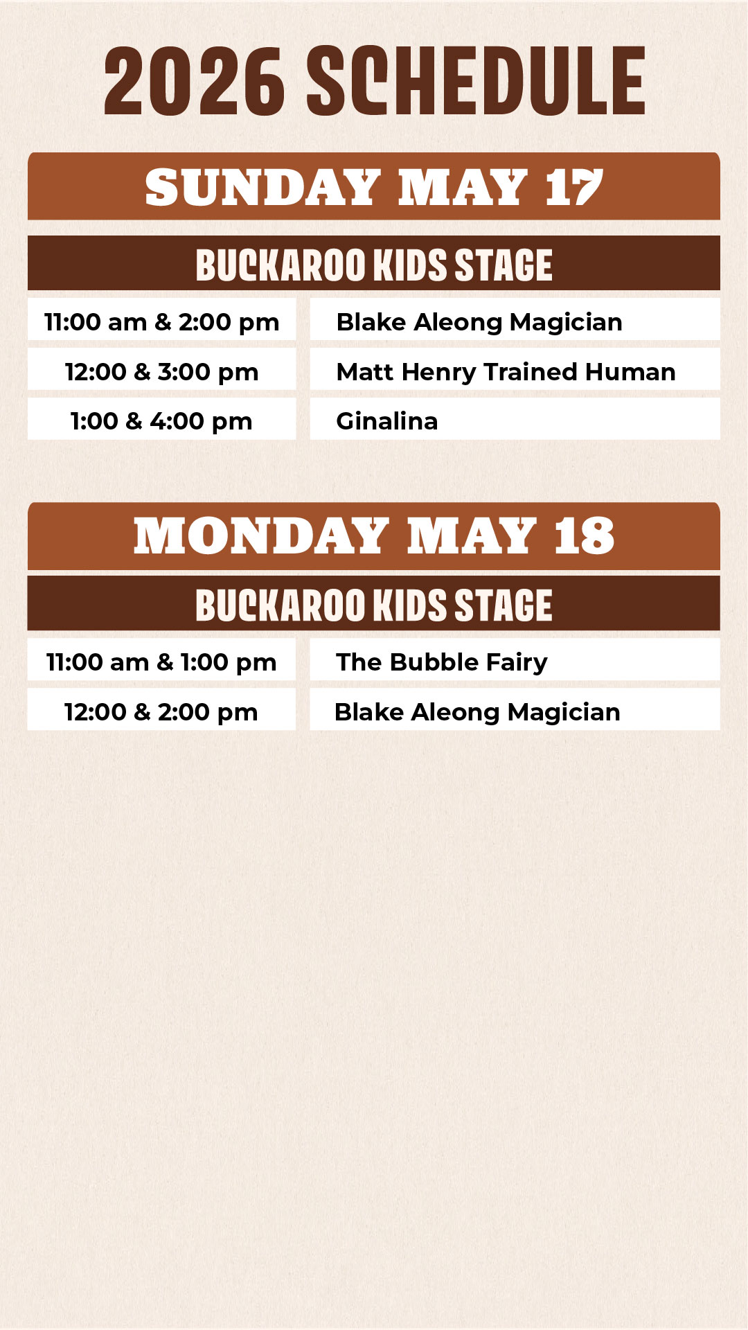 - NEW Buckaroo Stage – The rec centre comes alive with a full lineup of fun, family-friendly performances