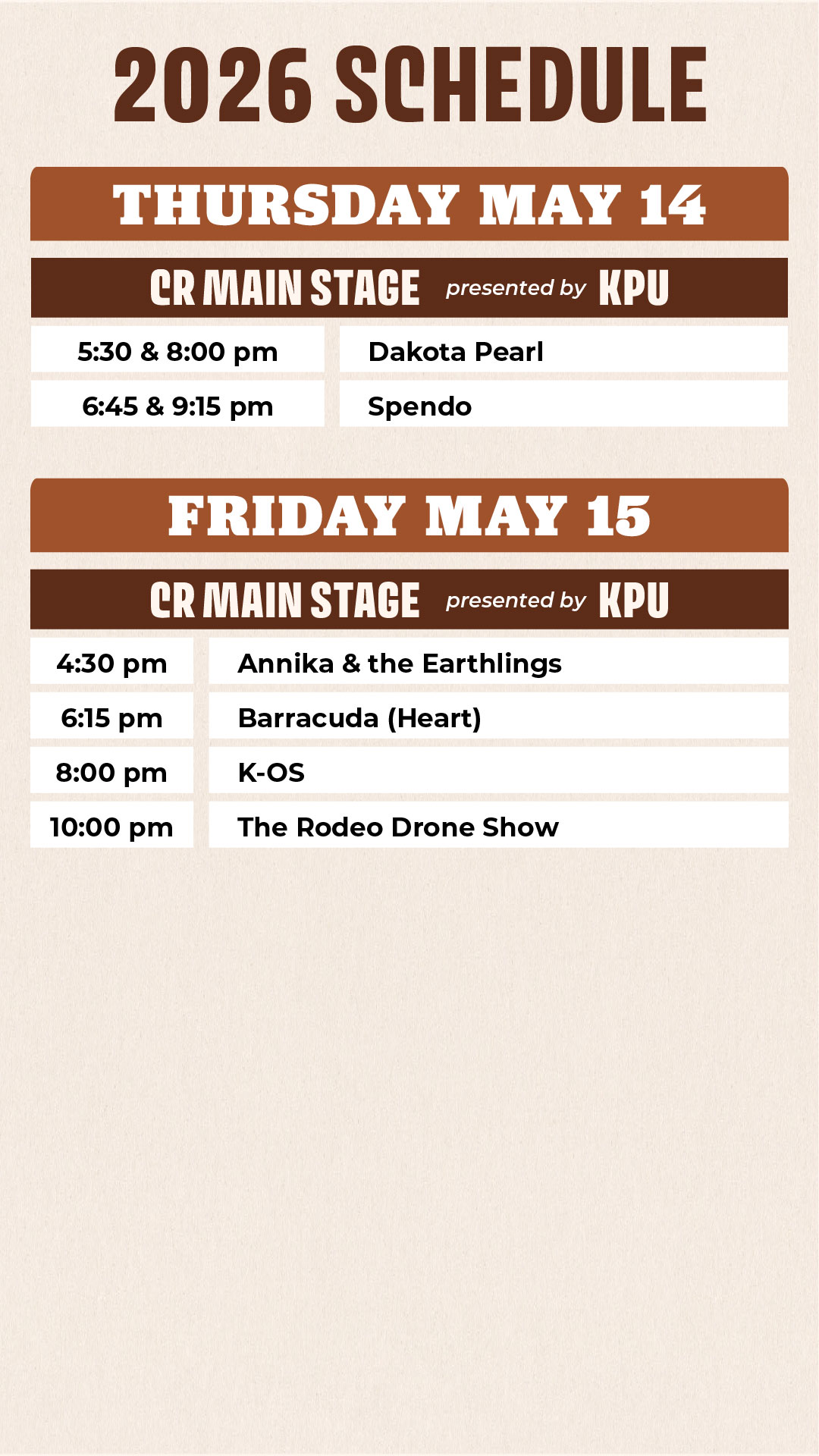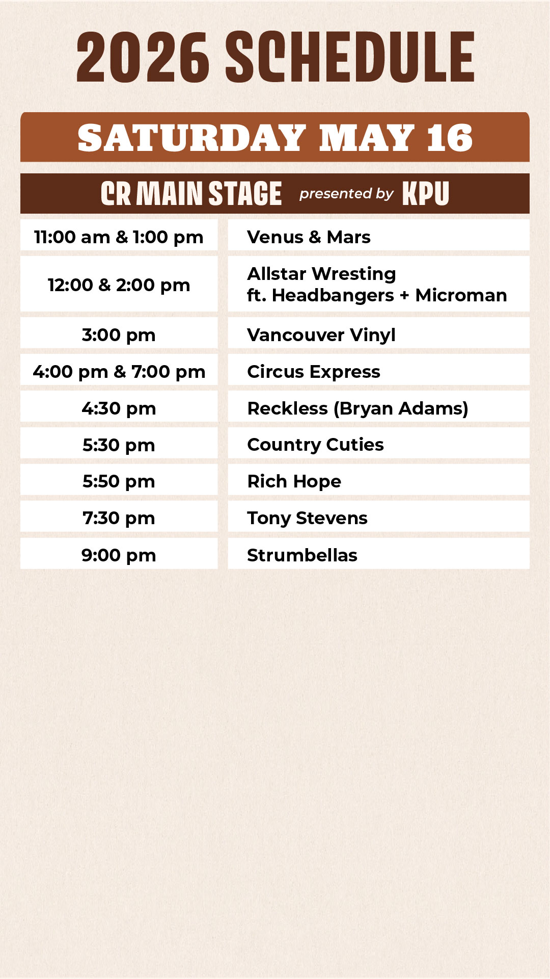 Fuel your time at the CR Corral with quick, crowd-pleasing favourites just steps from the stage. Grab a fresh coffee from Cheyenne Coffee, cool off with a Slush Zone slurpy, or snack on gourmet pretzels from Mr. Pretzel and classic hot dogs and bratwurst from Mr. Tube Steak—perfect for keeping you going between shows.