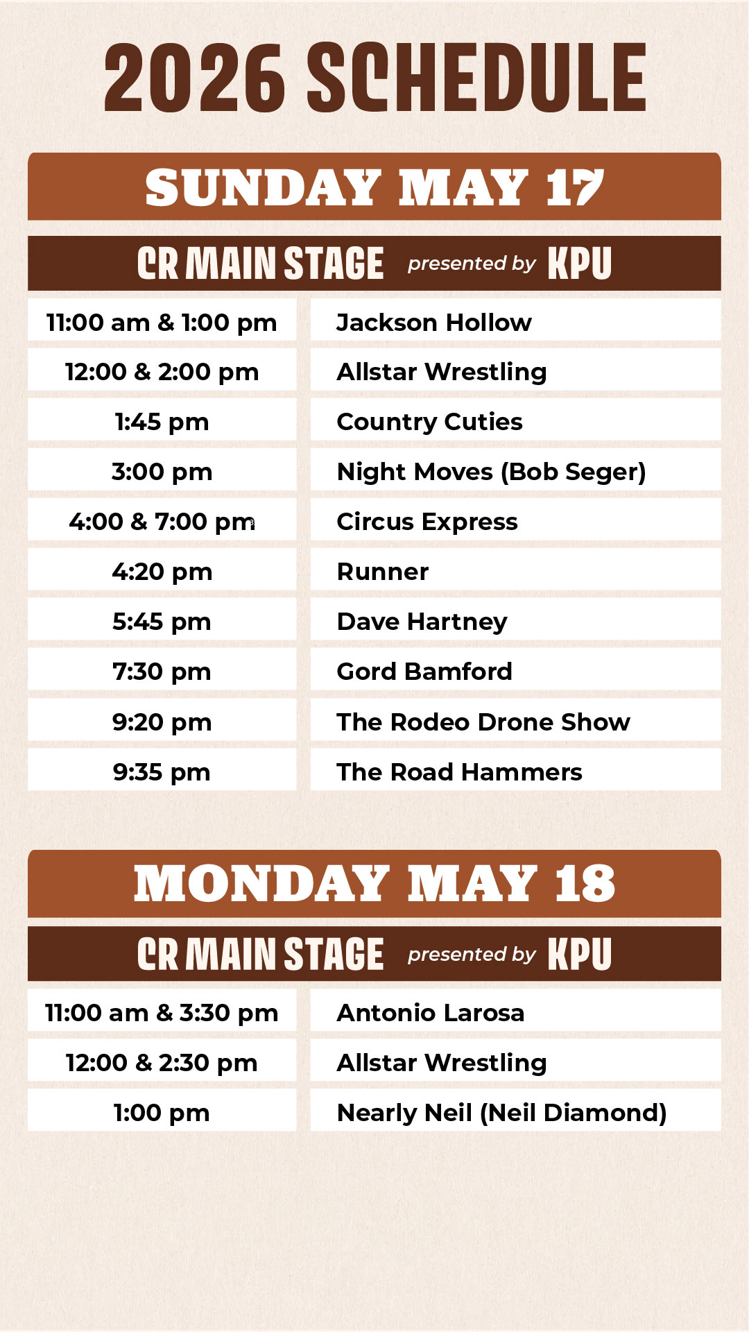 You can’t miss it! The CR Corral is located in the heart of the fairgrounds! (62 ave) Look for the giant stage and big CR Corral archways.