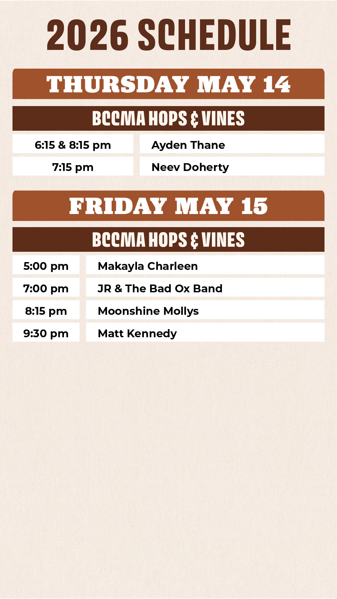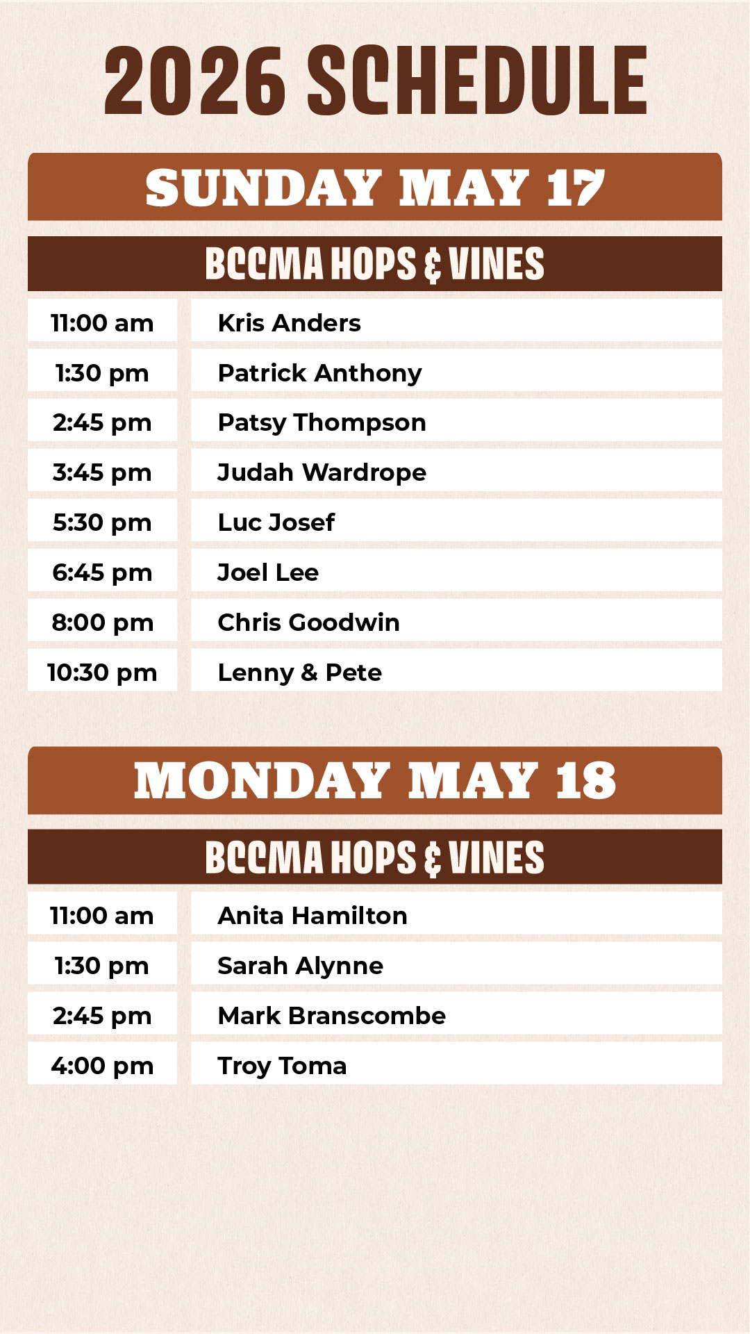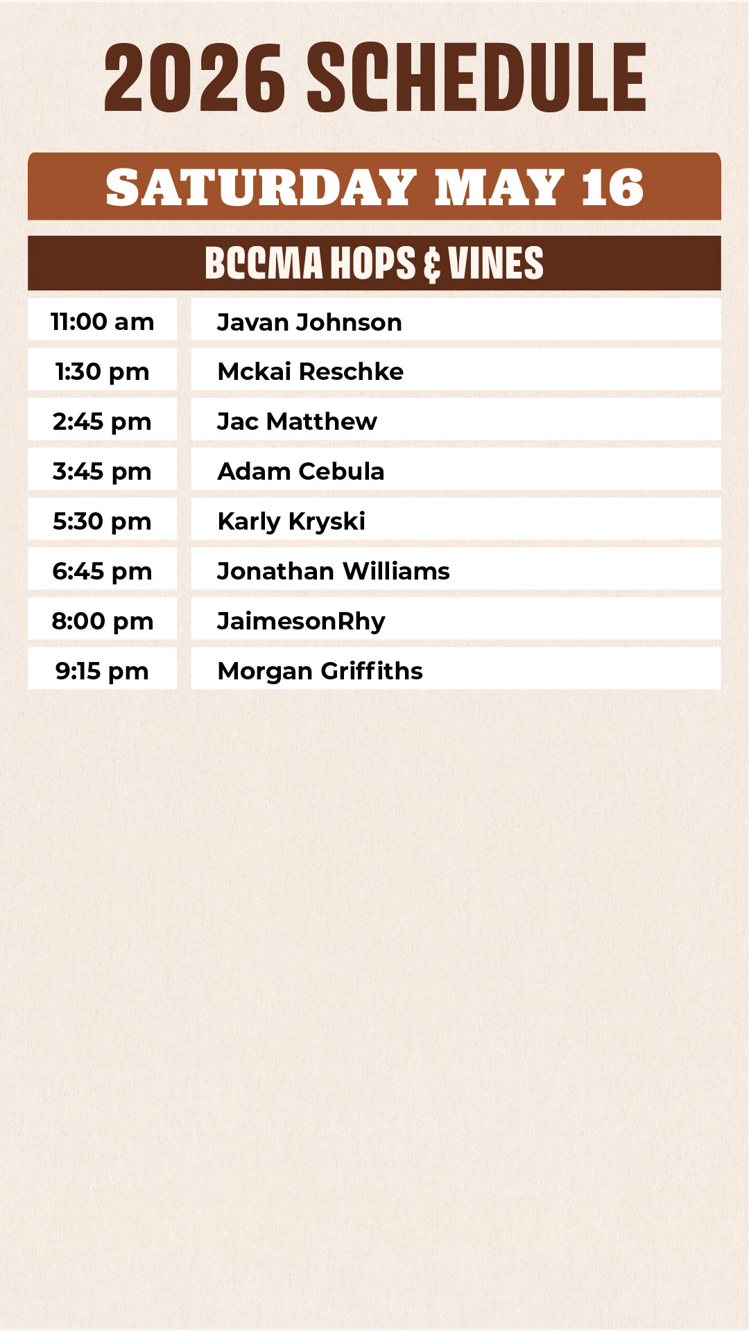 Hops & Vines Schedule